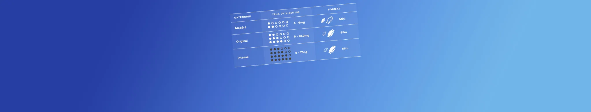 Plusieurs critères permettent de choisir le sachet de nicotine. Tout d'abord, quelle quantité de nicotine désirez-vous ? La teneur en nicotine est mesurée en milligrammes par gramme (mg/g). La plupart des produits sur le marché se situent entre 2mg/g et 5mg/g. Si vous êtes un consommateur adulte de produits nicotinés novice en matière de sachets de nicotine, nous vous recommandons de commencer par le taux de nicotine le plus faible.