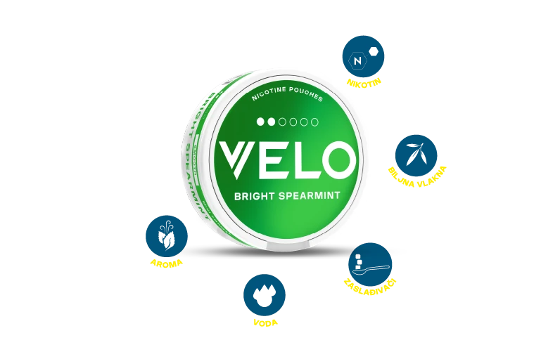 VELO SADRŽI VODU, SASTOJKE NA BILJNOJ BAZI, AROME, ZASLAĐIVAČE I NIKOTIN. SVE UPAKIRANO​ U MALE VREĆICE.​