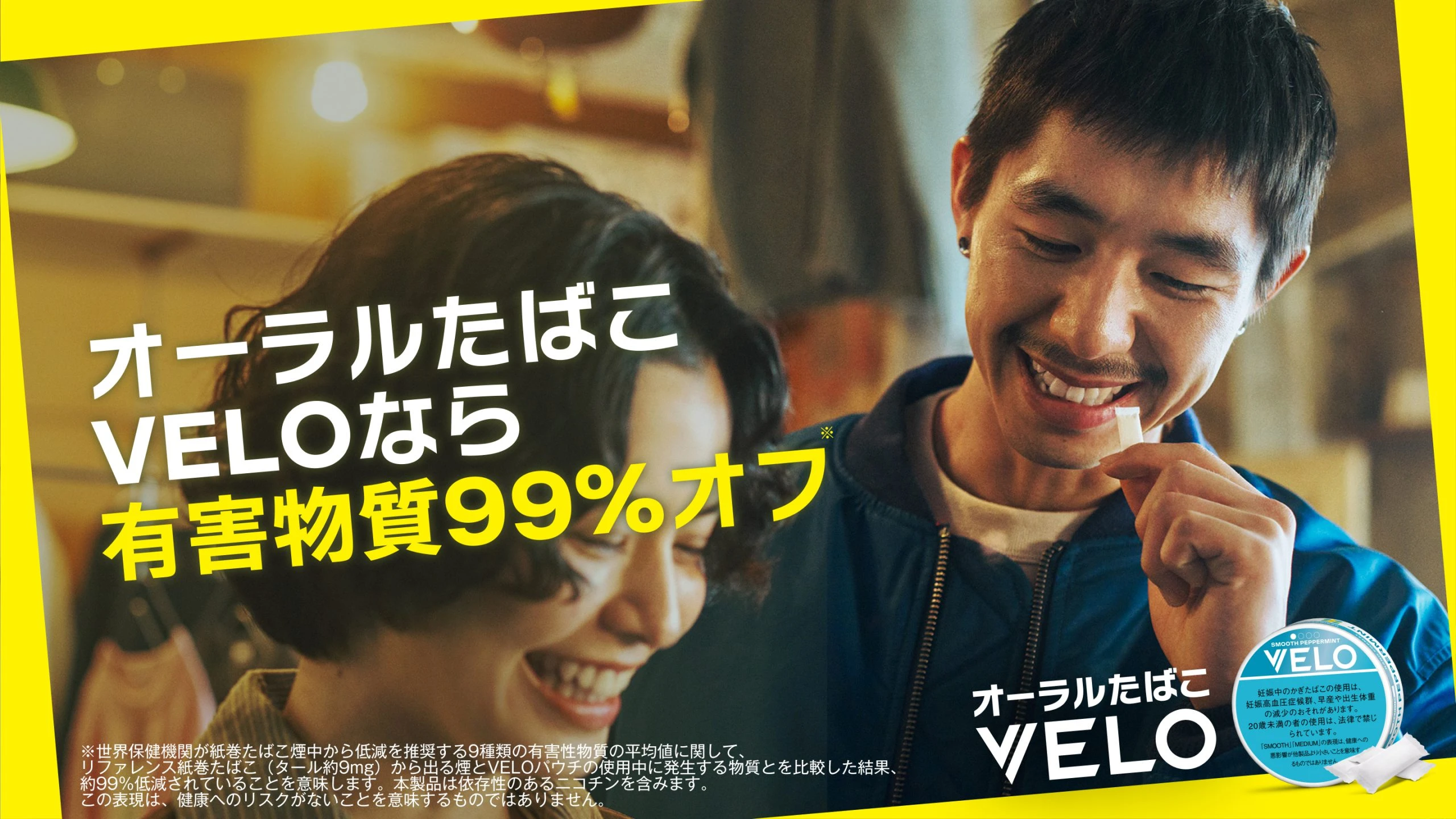 ※ 本製品は健康へのリスクがないものではなく、依存性のあるニコチンを含有しています。本比較は、リファレンス紙巻きたばこ(タール約9mg)から発生する煙とVELOの使用時に放出される物質について、紙巻たばこの煙中からの削減優先度が独立して選定された9種類の有害性物質の平均値に基づき評価したものです。