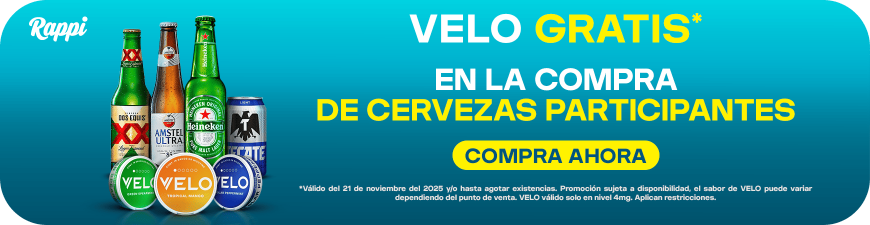 **Válido del 21 de noviembre al 21 de diciembre del 2025 y/o hasta agotar existencias. Promoción sujeta a disponibilidad, el sabor de VELO puede variar dependiendo del punto de venta. VELO válido solo en nivel 4mg. Aplican restricciones.