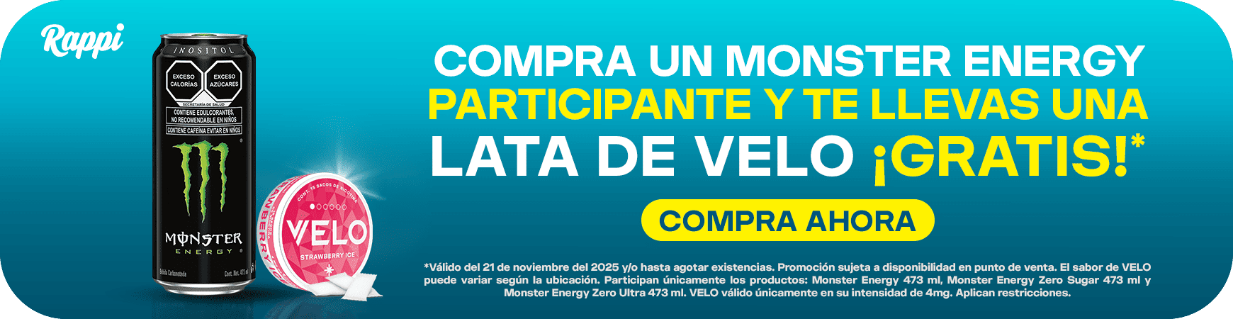 **Válido del 21 de noviembre al 21 de diciembre del 2025 y/o hasta agotar existencias. Promoción sujeta a disponibilidad en punto de venta. El sabor de VELO puede variar según la ubicación. Participan únicamente los productos: Monster Energy 473 ml, Monster Energy Zero Sugar 473 ml y Monster Energy Zero Ultra 473 ml. VELO válido únicamente en su intesidad de 4mg. Aplican restricciones.