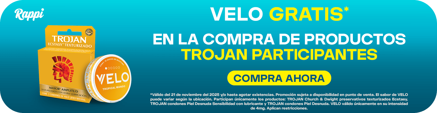 **Válido del 21 de noviembre al 21 de diciembre del 2025 y/o hasta agotar existencias. Promoción sujeta a disponibilidad en punto de venta. El sabor de VELO puede variar según la ubicación. Participan únicamente los productos: TROJAN Church & Dwight preservativos texturizados Ecstasy, TROJAN condones Piel Desnuda Sensibilidad con lubricante y TROJAN condones Piel Desnuda. VELO válido únicamente en su intensidad de 4mg. Aplican restricciones.