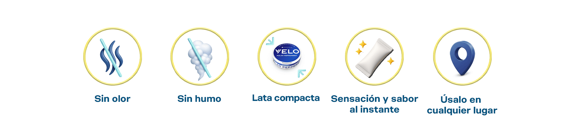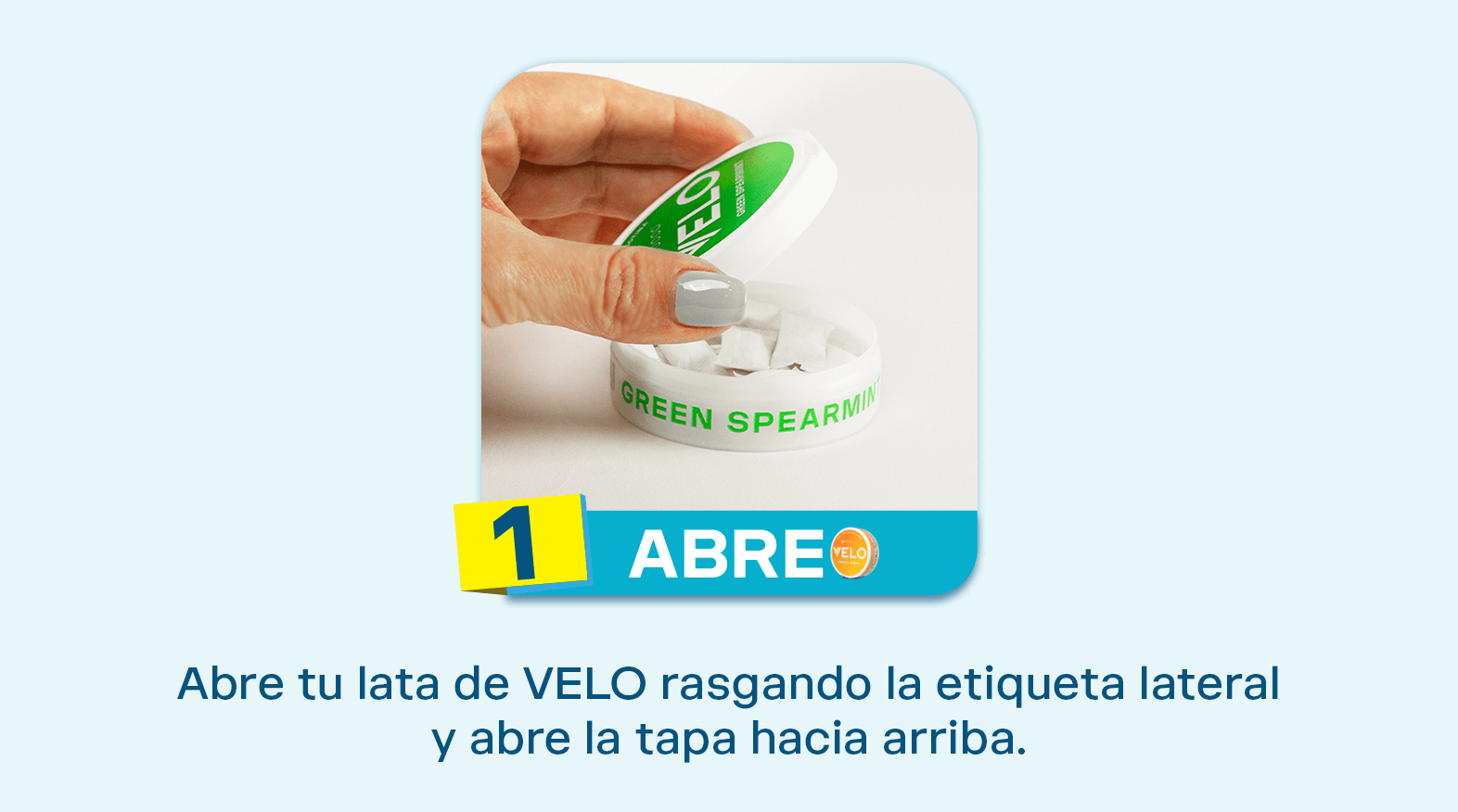 VELO está diseñado para usarse colocando la bolsa de nicotina entre el labio superior y la encía, así la nicotina se absorbe por medio de la encía.