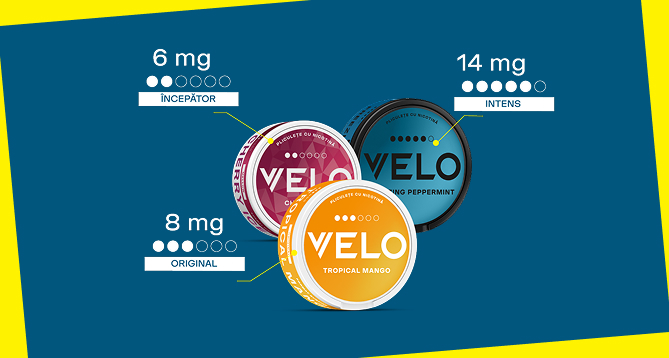 Pliculețele VELO sunt disponibile în diferite concentrații de nicotină, de la 4 la 17 mg. Folosește sistemul nostru de puncte pentru a te asigura că alegi concentrația potrivită pentru tine. Mai puține puncte înseamnă mai puțină nicotină, în timp ce șase puncte indică pliculețele noastre cu cea mai mare concentrație de nicotină. Pliculețele VELO sunt disponibile într-o varietate de arome, inclusiv cu arome de fructe și mentă. Află mai multe despre cum să alegi pliculețul de nicotină potrivit pentru tine în ghidul nostru util.