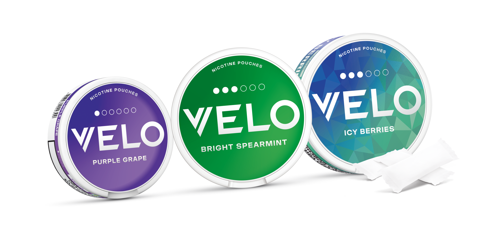 Pakovanje sadrži 20 ili 15 komada nikotinskih vrećica. VELO proizvodi koji sadrže 20 vrećica su Icy Berries 10 mg, Purple Grape 8 mg, Spiffy Spearmint 10 mg i Mighty Peppermint 14 mg i 17 mg, dok oni koji sadrže 15 vrećica su Purple Grape